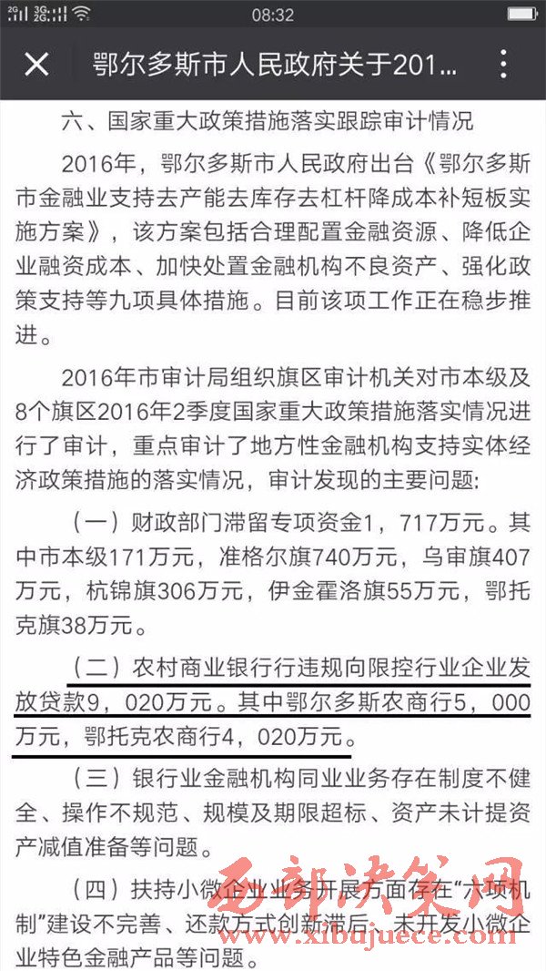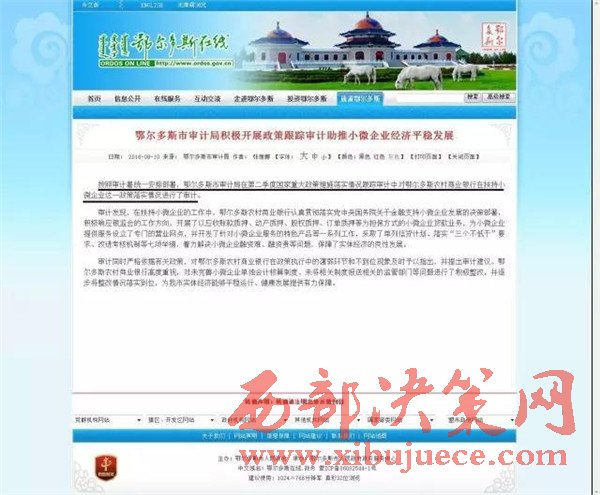 鄂爾多斯市人民政府網(wǎng)站刊登文章中稱:按照審計署統(tǒng)一安排部署,鄂爾多斯市審計局在第二季度國家重大政策措施落實情況跟蹤審計中對鄂爾多斯農(nóng)村商業(yè)銀行在扶持小微企業(yè)這一政策落實情況進行了審計。