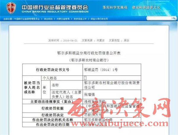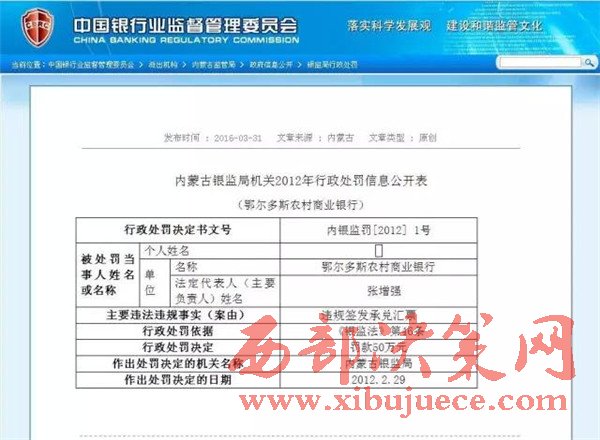 另查明:鄂爾多斯農(nóng)村商業(yè)銀行法人張增強,又是內(nèi)蒙古信用聯(lián)合社理事會理事,共產(chǎn)黨黨員,管理不善,多次因非法經(jīng)營舉報,其中2012年2月29日,因違規(guī)簽發(fā)承兌匯票被內(nèi)蒙古銀監(jiān)局罰款50萬。