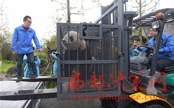 3月24日,工作人員在中國(guó)大熊貓保護(hù)研究中心都江堰基地隔離檢疫區(qū)準(zhǔn)備將大熊貓“寶寶”搬運(yùn)至盼盼園。