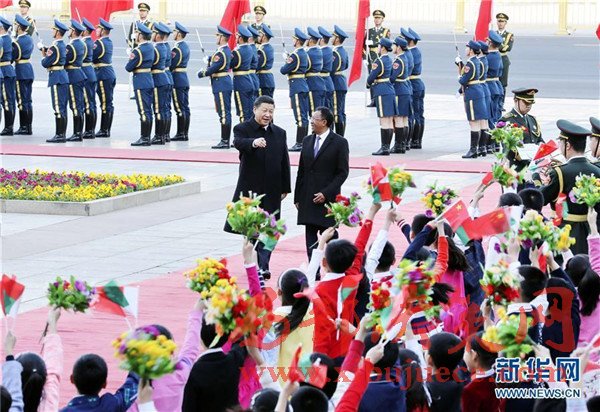 3月27日,國家主席習(xí)近平在北京人民大會堂同馬達加斯加總統(tǒng)埃里舉行會談。這是會談前,習(xí)近平在人民大會堂東門外廣場為埃里舉行歡迎儀式。