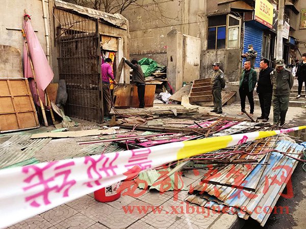 昨日下午5時許,記者在北火巷小區(qū)南口看到,數(shù)名工人正在對沿街違章建筑進行拆除。小區(qū)11號樓一沿街人行道上,拉起有數(shù)十米長的警戒線,警戒線內(nèi)被拆下的防盜網(wǎng)招牌等雜物堆積在一旁等待處理。據(jù)小區(qū)住戶說,該區(qū)域被個別經(jīng)營戶長期“占領(lǐng)”擺攤經(jīng)營的現(xiàn)象終于得到了改善。