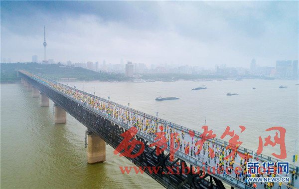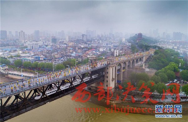 4月9日,馬拉松選手在武漢長江大橋上奔跑。