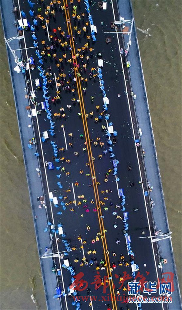 4月9日,馬拉松選手經(jīng)過武漢長江大橋上的補給點。