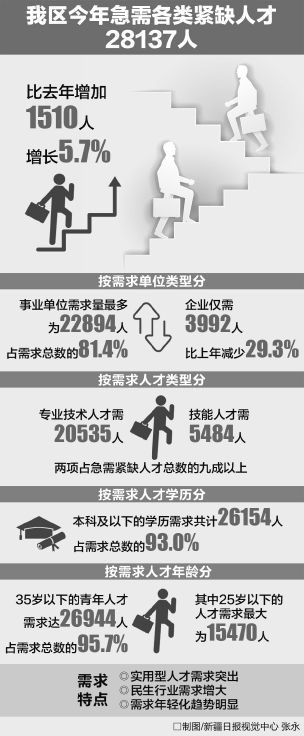 “根據(jù)調(diào)查顯示,這幾年新疆急需緊缺人才需求數(shù)量連年增長,2017年比去年增加1510人,增長5.7%。”自治區(qū)人力資源和社會保障廳人力資源市場處處長趙倩說。