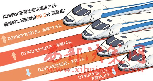 那么調(diào)價(jià)就是漲價(jià)嗎?其實(shí)并不是。工作人員介紹說,以深圳北至潮汕的高鐵票價(jià)為例,調(diào)整前二等座執(zhí)行票價(jià)為89.5元,調(diào)整后同樣區(qū)間,D3108次為107元,漲幅19.6%;D2342次為102元,漲幅14%;D2350次為85元,下調(diào)5%;D7406次為73元,下調(diào)18.4%。