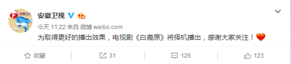 很多守在電視機(jī)前準(zhǔn)備看《白鹿原》的觀眾都撲空了,江蘇衛(wèi)視和安徽衛(wèi)視原計(jì)劃播放第2集的時(shí)間卻各自播放了其他內(nèi)容,但兩方都未對《白鹿原》停播作出解釋。就在今日,兩家衛(wèi)視都官方發(fā)表聲明表示,“為取得更好的播出效果,電視劇《白鹿原》將擇機(jī)播出,感謝大家關(guān)注!”
