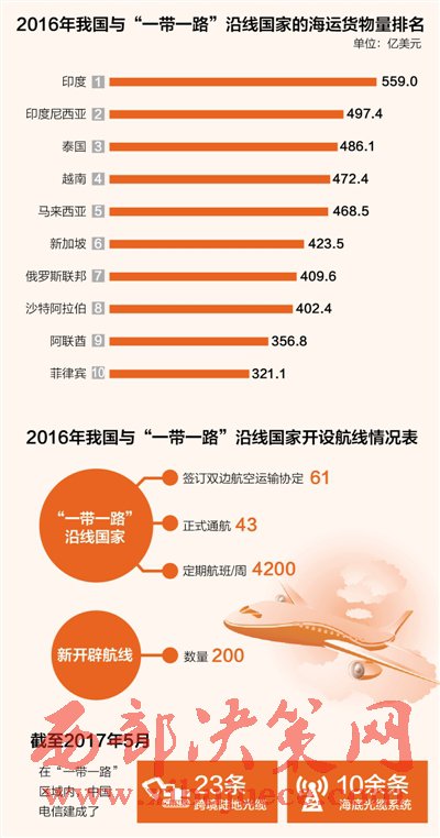 據(jù)統(tǒng)計(jì),通過73個(gè)公路和水路口岸,中國與相關(guān)國家開通了356條國際道路客貨運(yùn)輸線路;海上運(yùn)輸服務(wù)已覆蓋“一帶一路”沿線所有國家;與43個(gè)沿線國家實(shí)現(xiàn)空中直航,每周約4200個(gè)航班;簡化了國際鐵路聯(lián)運(yùn)辦理手續(xù),促進(jìn)中歐間國際鐵路貨物聯(lián)運(yùn),開展國際鐵路運(yùn)郵合作。
