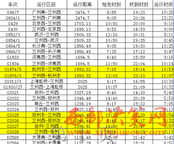 從寶蘭高鐵列車開行方案來看,蘭州西至北京西開行動(dòng)車組列車1對(duì),為列車雙向?qū)﹂_,共計(jì)運(yùn)行1699公里,9:53從蘭州西站始發(fā),18:53達(dá)到北京西站,車次為 G430次,運(yùn)行時(shí)間9小時(shí)整;10:50從北京西站始發(fā),20:00到達(dá)蘭州西站,車次為 G429次。蘭州西至廣州南開行動(dòng)車組列車1對(duì),為列車雙向?qū)﹂_,共計(jì)運(yùn)行2474.7公里,8:05從蘭州西站始發(fā),20:26到達(dá)廣州南站,車次為 G834/1次;8:55從廣州南站始發(fā),19:23到達(dá)蘭州西站,車次為 G96/7次,運(yùn)行時(shí)間10小時(shí)28分。蘭州西至上海虹橋站開行動(dòng)車組列車1對(duì),為列車雙向?qū)﹂_,共計(jì)運(yùn)行2025公里,10:37從蘭州西站始發(fā),21:09到達(dá)上海虹橋站,車次為 G1930/27次,運(yùn)行時(shí)間10小時(shí)32分;6:17從上海虹橋站始發(fā),16:55到達(dá)蘭州西站,車次為 G1912/3次。