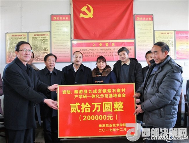 12月15日,為為貫徹落實 《全省脫貧攻堅 2017冬季行動方案》精神,扎實推進高校結(jié)對幫扶“雙百工程”,有效地為當?shù)靥厣a(chǎn)業(yè)服務,楊凌職業(yè)技術(shù)學院黨委書記趙曼、黨委副書記任得元一行來到麟游縣九成宮鎮(zhèn)紫石崖村,為該村捐贈20萬元,用于建立中蜂養(yǎng)殖產(chǎn)學研一體化示范基地、核桃豐產(chǎn)栽培產(chǎn)學研一體化示范基地及電商網(wǎng)絡平臺。