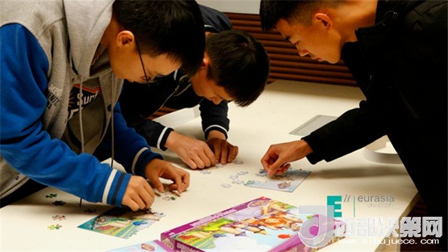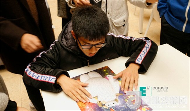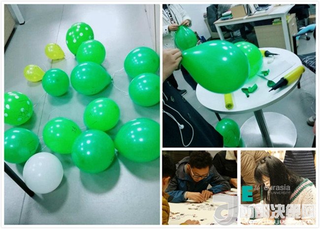 土豆和西紅柿根本就不是一個(gè)世界的,但它們走到了一起,變成了薯?xiàng)l和番茄醬它倆就是絕配;學(xué)籍制度和競(jìng)技運(yùn)動(dòng)也不是一個(gè)世界的,但它們?nèi)诤显诹艘黄?,變成了頭腦風(fēng)暴和趣味運(yùn)動(dòng)它們也可以很般配,現(xiàn)在就讓我們來看看它們是怎么融合的……聽那陣陣氣球爆炸的聲音,他們開始了!在這些綠油油的氣球中有事先設(shè)置的題目隊(duì)員們要先擠爆氣球答完題才能得到下一個(gè)地方的線索,“補(bǔ)考成績(jī)不合格以及成績(jī)低于50分必須怎樣?”“本科選修課學(xué)分不得低于多少學(xué)分?”這些題是不是還要開動(dòng)腦袋瓜仔仔細(xì)細(xì)的想想才有答案呢?在比賽的現(xiàn)場(chǎng)一秒都會(huì)和對(duì)手拉開差距,容不得一絲猶豫拿到線索的隊(duì)員們又奔向下一個(gè)地點(diǎn)熟悉的教室,這里也不是那么容易通過,看著黑板上的題“冰怎么很快的化成水?”“可替代大學(xué)英語(yǔ)四級(jí)成績(jī)的考試有哪些?”哦,還有計(jì)算題,隊(duì)員們必須腦洞大開,腦細(xì)胞飛速運(yùn)轉(zhuǎn),做學(xué)霸那也是不容易的。只見黑板上粉筆一起一落,答題完畢,看看線索迅速趕往下一地點(diǎn)——地中海。這里指壓板、跳繩早已準(zhǔn)備好等著隊(duì)員們,學(xué)霸不能只管學(xué)習(xí)身體素質(zhì)也很重要,動(dòng)起來吧!在指壓板上跳繩,誰(shuí)想出來的?忍受著腳底的疼痛還要揮動(dòng)跳繩?太受虐,但是我們是一群不屈不撓的新一代,指壓板上跳繩我們也是鏗鏘有力、一絲不茍。終于結(jié)束痛并快樂著的跳繩環(huán)節(jié),卻看到了整整400塊的拼圖,這個(gè)環(huán)節(jié)真是讓人又愛又恨,還記得兒時(shí)玩拼圖的快樂,但在這激烈的競(jìng)爭(zhēng)環(huán)境下,卻是讓人有點(diǎn)心慌和畏懼。隊(duì)員們最終齊心協(xié)力戰(zhàn)勝了它,細(xì)心、耐心的逐一完好的拼完了每一副圖。