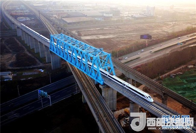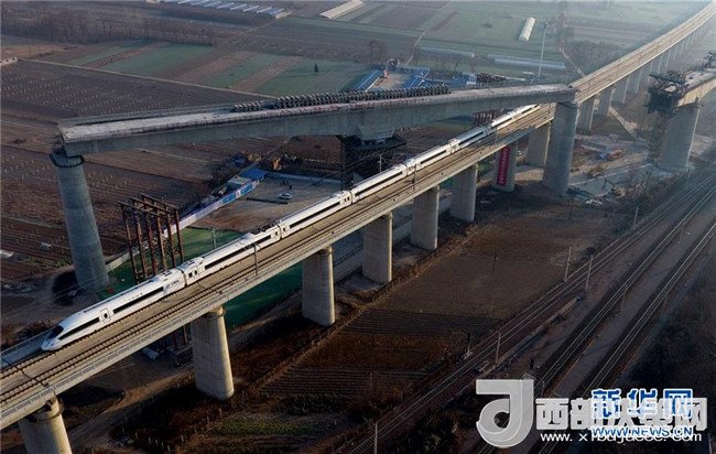 西成高鐵由西安北站駛出的列車(chē)經(jīng)過(guò)西成高鐵跨西寶高鐵特大橋(12月6日攝)。12月6日,西安至成都高速鐵路全線(xiàn)開(kāi)通運(yùn)營(yíng),兩地的最短旅行時(shí)間壓縮至4小時(shí)7分。
