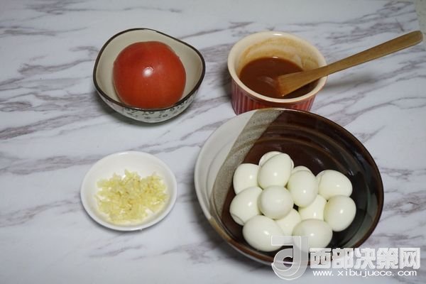 鵪鶉蛋15個、番茄1個、番茄醬3大勺、蒜蓉適量、食用油、鹽、糖。