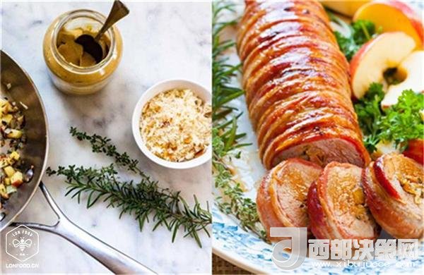 7、將烤好的夾心培根里脊卷切片,旁邊放置蘋果、迷迭香等配菜,大功告成!