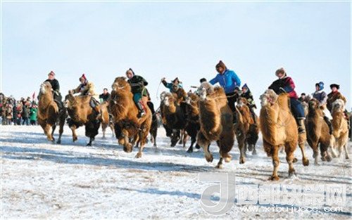 這邊還沒有欣賞完駱駝的高大靜美,馬隊(duì)的馳騁再次讓觀眾熱血沸騰。一縱疾馳的駿馬驕傲地?fù)P著頭顱,鬢毛高高飛起,厚重的積雪并沒有減慢馬兒奔跑的速度,雪團(tuán)如碎銀一般在它們腳下飛灑,而騎手們紅綠藍(lán)各異的蒙古皮袍也分外吸引眼球。緊接著還有射箭、駱駝拉爬犁等精彩表演。