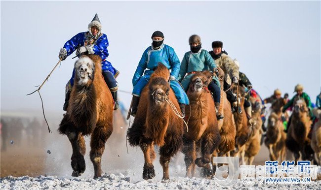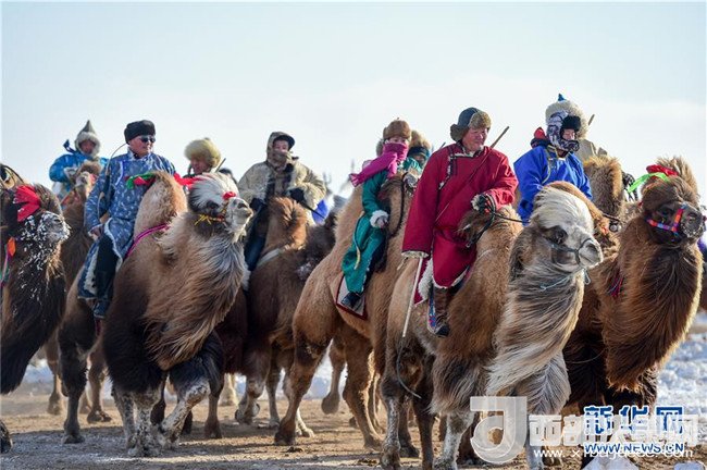 1月16日,在內(nèi)蒙古錫林浩特鳳凰馬場(chǎng),當(dāng)?shù)貫跆m牧騎的演員們騎著駱駝進(jìn)入會(huì)場(chǎng)演出。