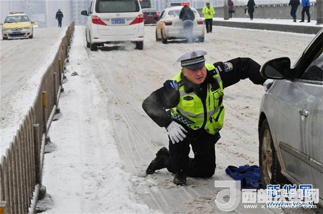 1月27日,在湖北省武漢市江漢一橋橋面,民警將衣服鋪墊在雪地上協(xié)助推車。(金思柳 攝)