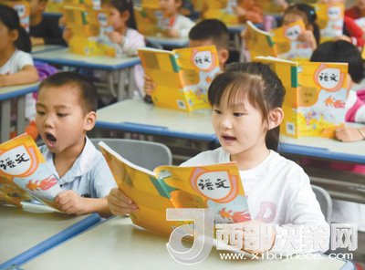 2017年8月31日,安徽合肥少兒藝術(shù)學(xué)校一年級(jí)學(xué)生在開(kāi)學(xué)預(yù)備課上熟悉新編語(yǔ)文教材。(記者張端攝)