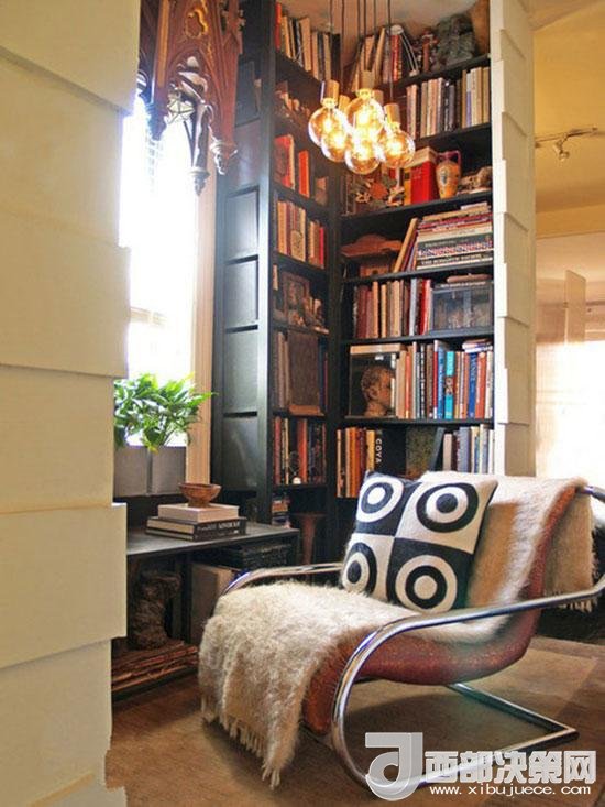 一個(gè)局促的轉(zhuǎn)角,被打造成了藏書(shū)空間,黑色的書(shū)架顯得厚重大氣,塞滿(mǎn)書(shū)本以后更有沉淀韻味。坐在舒適的躺椅上閱讀,體驗(yàn)有滋有味的生活。
