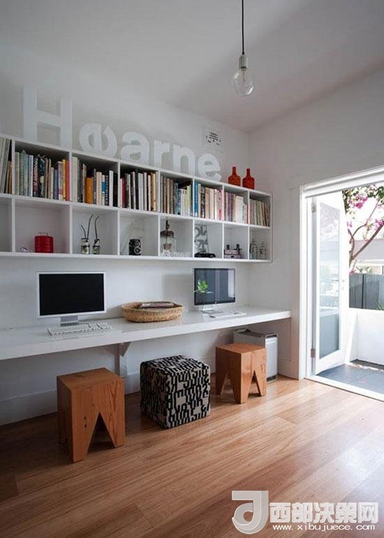 橫向延伸的書(shū)架與桌板,打造出了可供雙人使用的工作臺(tái),線(xiàn)條簡(jiǎn)潔流暢,也能讓兩個(gè)人毫無(wú)障礙地溝通交流。
