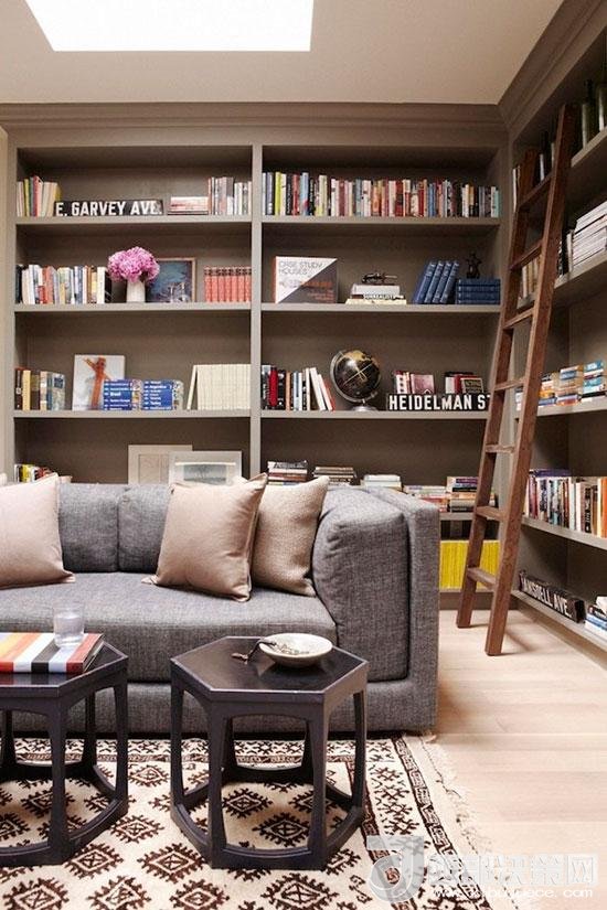把全部的墻面都用來(lái)打造書(shū)架,用成摞的書(shū)本塞得滿(mǎn)滿(mǎn)當(dāng)當(dāng),充實(shí)感油然而生。高處的書(shū)本也不怕夠不到,只要有一把梯子就能解決問(wèn)題。