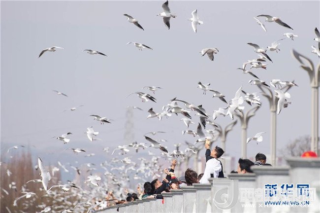 2月21日,游人在昆明市滇池海埂觀景大道上觀賞、投喂紅嘴鷗。