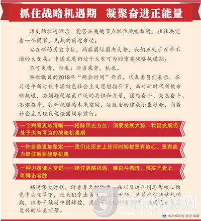 舉世矚目的2018年“兩會時間”開啟。代表委員們表示,在習(xí)近平新時代中國特色社會主義思想指引下,面對新時代新使命新機遇,必須凝聚起最廣泛的共識和力量,團結(jié)奮斗、矢志奮斗、不懈奮斗,打開機遇的未來空間,決勝全面建成小康社會,向著社會主義現(xiàn)代化強國闊步前行。
