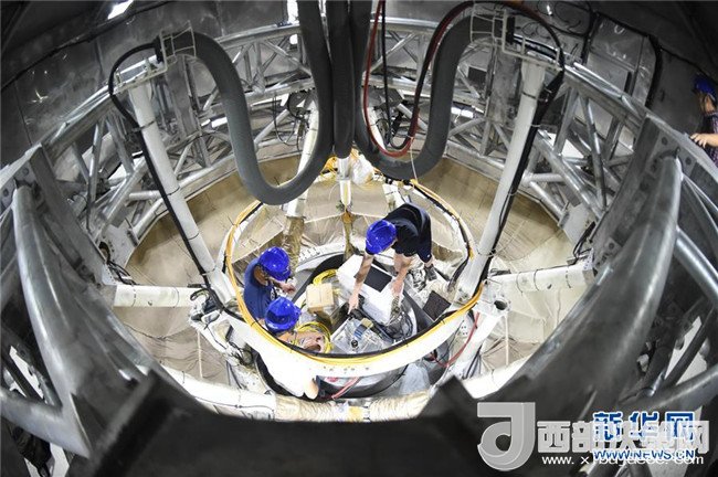 工作人員在FAST饋源艙內(nèi)作業(yè)(2017年8月10日攝)。