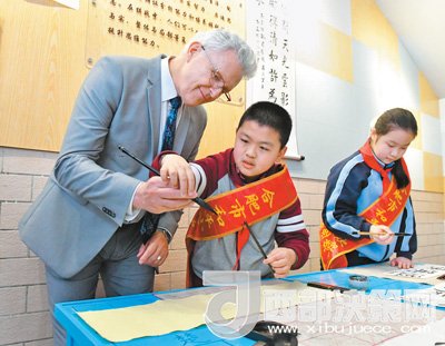 加拿大客人和小學(xué)生一起學(xué)書法