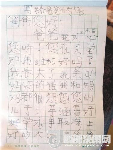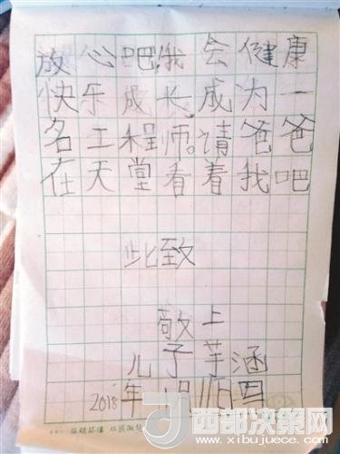 “爸爸您好。爸爸我好想您呀!您在天堂那邊過(guò)的好嗎?我長(zhǎng)大了,我會(huì)聽(tīng)媽媽的話。我和媽媽都想您。您的兒子芋涵要好好學(xué)習(xí),爭(zhēng)取考上好的大學(xué)。請(qǐng)爸爸放心吧。我會(huì)健康快樂(lè)成長(zhǎng)為一名工程師。請(qǐng)爸爸在天堂看著我吧。此致,敬上。兒子芋涵。2018年1月11日寫。”