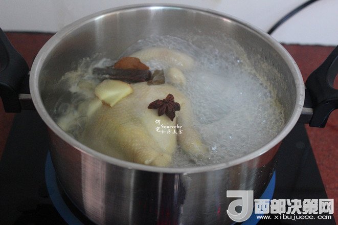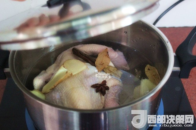 3.把洗凈的整只雞放入鍋中,然后放桂皮、生姜、香葉、八角,料酒、鹽,再倒入適量的清水,水要浸沒整只雞即可;