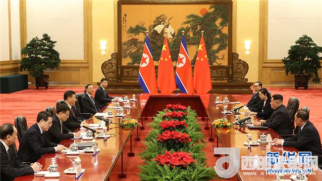 在會談中,習近平代表中共中央對金正恩首次訪問中國表示熱烈歡迎。習近平表示,你在中共十九大后電賀我再次當選中共中央總書記、就任黨中央軍委主席,前些天又第一時間電賀我再次當選國家主席、國家中央軍委主席,我對此表示感謝。此次來華訪問,時機特殊、意義重大,充分體現(xiàn)了委員長同志和朝黨中央對中朝兩黨兩國關(guān)系的高度重視,我們對此高度評價。