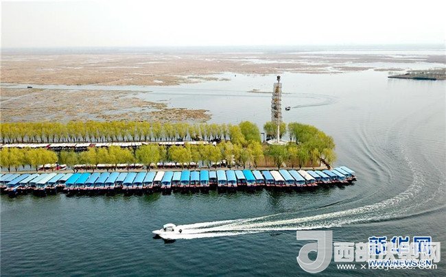 一艘游船在白洋淀景區(qū)旅游碼頭內行駛(3月30日無人機拍攝)。新華社記者 牟宇 攝
