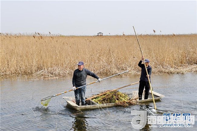 工人在白洋淀景區(qū)內清理漂浮物(3月29日攝)。新華社記者 牟宇 攝