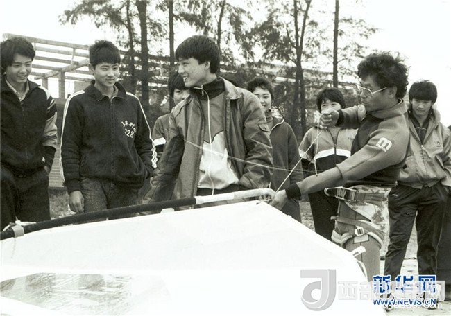 來自臺灣的帆板運動員在??诤彤數厝罕娊涣鳎?989年1月16日攝)。新華社記者 姜恩宇 攝