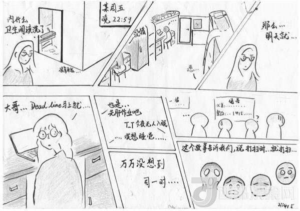 “當聽說要畫檢討,我的第一反應是‘竟然還有這種操作’?!”一位因寢室衛(wèi)生不達標而交給李雍一張“漫畫體”檢討的學生告訴記者,相比文字的檢討,她對于畫畫這件事更容易接受。“因為文字檢討很多時候就是湊字數(shù),可能寫完沒幾天就忘了;但是畫漫畫檢討,需要把犯錯的原因以及反思都濃縮在一幅畫里,既要構圖還要有形象創(chuàng)作,這樣一來,對做錯事的印象會越發(fā)深刻,也更能夠走心。”