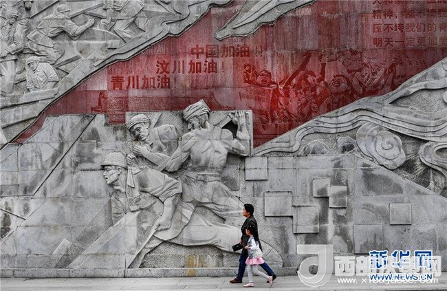 4月26日,市民從感恩奮進墻前走過。感恩奮進墻是花崗巖浮雕墻,長230米,高12米,再現(xiàn)了青川的風(fēng)土人情、歷史文化和眾志成城、自強不息的抗震救災(zāi)精神、地震災(zāi)后重建和生態(tài)青川的壯美畫卷。新華社記者陶明攝