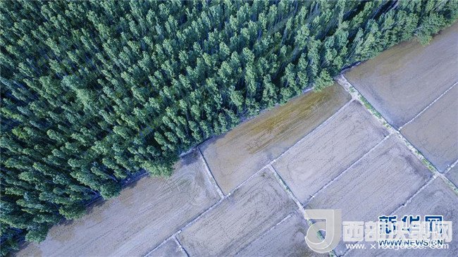 在新疆察布查爾錫伯自治縣扎庫(kù)齊牛錄鄉(xiāng)拍攝的一處防護(hù)林旁的水稻田(5月21日無(wú)人機(jī)拍攝)。近日,隨著氣溫漸高,地處新疆伊犁河谷的察布查爾錫伯自治縣迎來(lái)插秧高峰期,田間地頭一派繁忙景象。塊塊稻田水滿如鏡,田間防護(hù)林枝繁葉茂,遠(yuǎn)處雪山依稀可見(jiàn),如一幅在大地上鋪展開(kāi)的生態(tài)畫(huà)卷。新華社記者胡虎虎攝