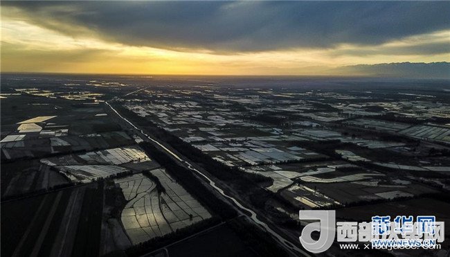 在新疆察布查爾錫伯自治縣種羊場(chǎng)托海依村拍攝的夕陽(yáng)下的農(nóng)田(5月21日無(wú)人機(jī)拍攝)。近日,隨著氣溫漸高,地處新疆伊犁河谷的察布查爾錫伯自治縣迎來(lái)插秧高峰期,田間地頭一派繁忙景象。塊塊稻田水滿如鏡,田間防護(hù)林枝繁葉茂,遠(yuǎn)處雪山依稀可見(jiàn),如一幅在大地上鋪展開(kāi)的生態(tài)畫(huà)卷。新華社記者胡虎虎攝