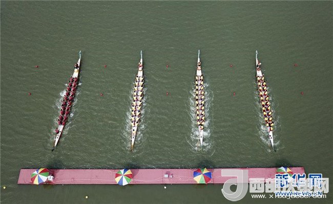 5月26日,參賽龍舟在浙江省溫州市會昌湖水面上比拼。當(dāng)日,浙江溫州第五屆龍舟聯(lián)賽的一場比賽在會昌湖水上公園龍舟基地舉行。眾多龍舟同場競技,上演了精彩的水上比拼。新華社發(fā)(蘇巧將攝)