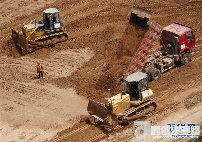 5月30日,工程車輛在延安黃河引水工程南河水庫施工現(xiàn)場進(jìn)行壩體填筑。