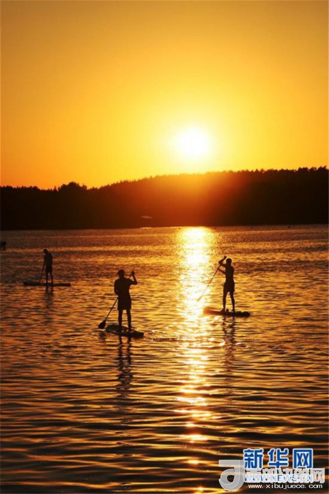 5月30日,特拉凱城堡所在的加爾韋湖上,年輕人在日落時分玩漿板沖浪。特拉凱城堡位于立陶宛首都維爾紐斯以西約25公里的加爾韋湖的一個湖心島上,始建于14世紀。新華社記者李驥志攝