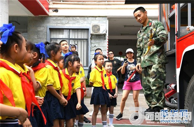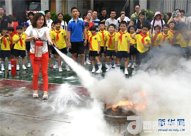 當日,數(shù)十名來自廣西南寧市濱湖路小學(xué)的孩子們和家長一起走進青秀區(qū)公安消防大隊柳沙中隊,參加消防疏散演習(xí)、參觀消防車、了解消防設(shè)備設(shè)施用途,在親子活動中學(xué)習(xí)消防知識。新華社記者 周華 攝