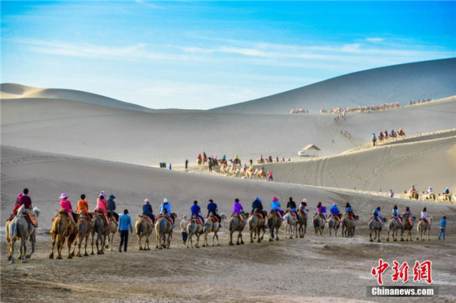 今年端午節(jié)期間,敦煌鳴沙山下駝隊如龍。王斌銀 攝