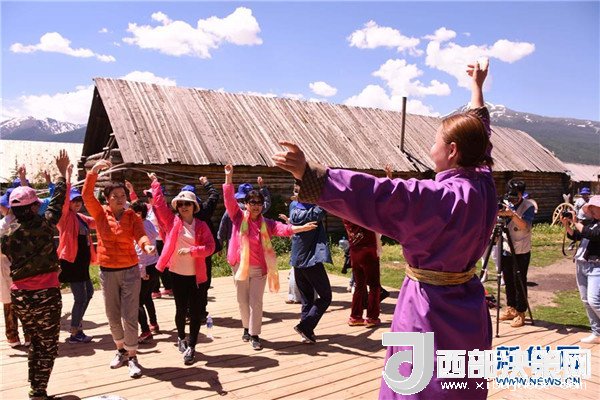 游客在喀納斯景區(qū)向當?shù)厣贁?shù)民族學習舞蹈(6月24日攝)。