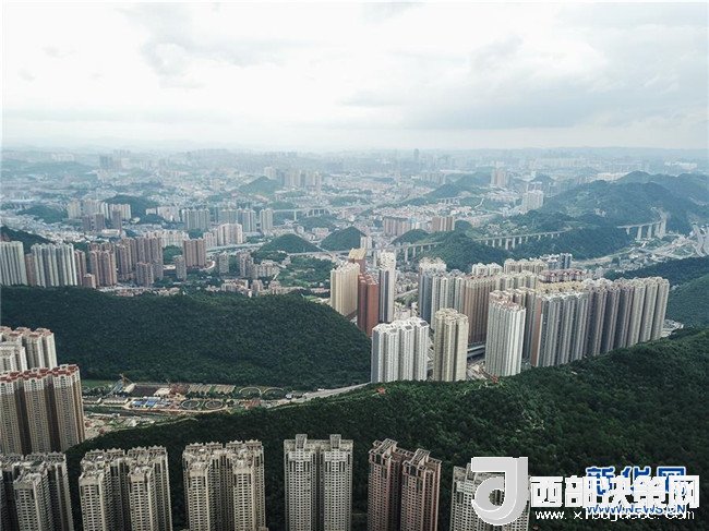 青山圍繞的貴陽市城區(qū)一隅(7月3日無人機拍攝)。