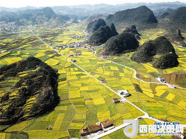 六盤水市六枝特區(qū)木崗鎮(zhèn)的油菜花田(3月9日無人機拍攝)。