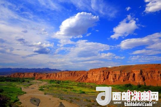 站在天山紅河谷入口處的斷崖邊,可以清晰地看到遠(yuǎn)處的天山,天然的紅土飄帶,一簇簇的綠蔭,坐落有致的農(nóng)家院落?;臎龅母瓯谂c斷崖下的美景,給人以強(qiáng)烈的視覺沖擊。紅色的山巖,猶如一條鑲嵌在天際間的飄帶而光彩奪目,河谷內(nèi)寧靜的村莊透露著幾分神秘。