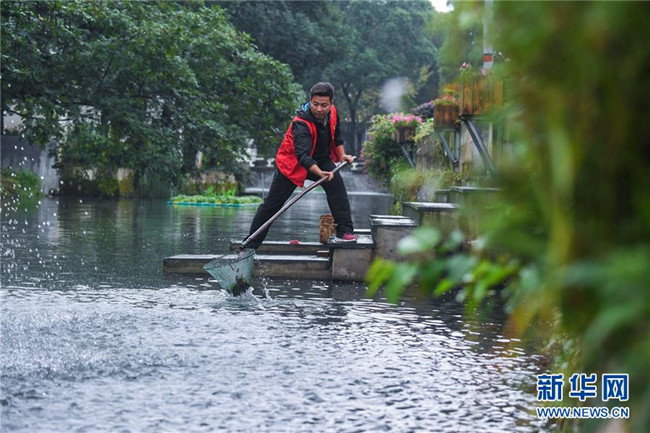 在浙江省長興縣龍山街道渚山村車渚港河道內(nèi),河長王佳進行日常鄉(xiāng)村河道護理巡查(2017年10月12日攝)。