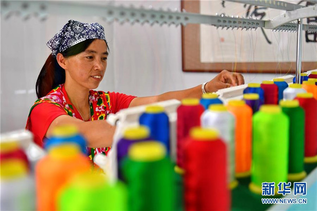 山西省臨縣寨則坪村是呂梁山上典型的貧困村。2017年5月,該村邀請縣里的老手藝人對10余位婦女進行布藝加工的集中培訓(xùn),并在村委院子里建起了布藝加工廠??恐庸じ挥挟?dāng)?shù)靥厣男瑝|、肚兜、布老虎等工藝品,這些婦女每月能拿到1500元的工資,這幫助她們順利摘下了“窮帽子”。新華社記者 曹陽 攝