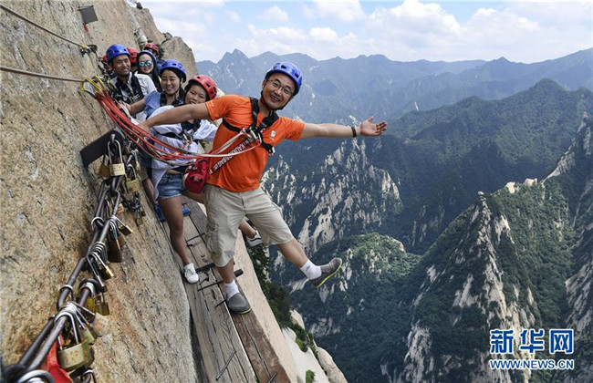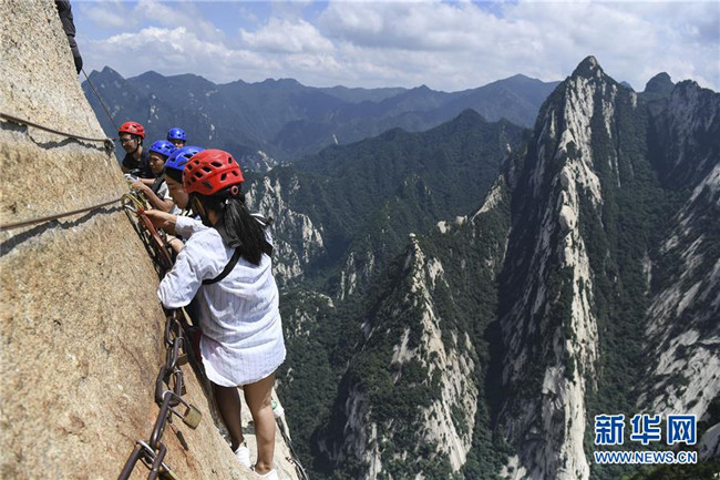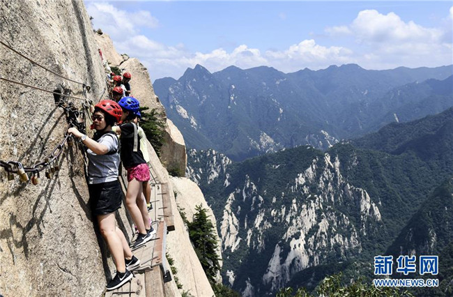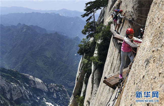 被譽(yù)為“華山第一天險(xiǎn)”的長(zhǎng)空棧道,位于陜西省華陰市五岳華山南峰東側(cè)山腰,在萬仞絕壁上鑲嵌石釘搭木椽而筑。 由于長(zhǎng)空棧道貼崖懸空,對(duì)探險(xiǎn)獵奇者極具誘惑性和挑戰(zhàn)性,吸引歷險(xiǎn)探勝者絡(luò)繹不絕。新華社記者 陶明 攝